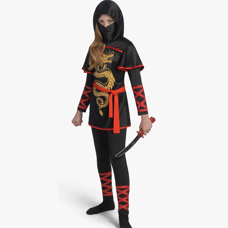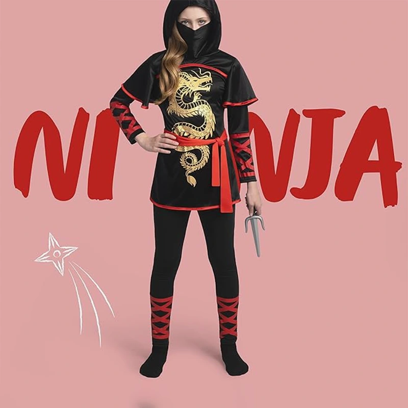 Το κοστούμι ninja για τα κορίτσια διαθέτει ένα κομψό, μαύρο κοστούμι διακοσμημένο με αυθεντικά σύμβολα ninja και λεπτομέρειες. Το κοστούμι περιλαμβάνει συνημμένα καλύμματα εκκίνησης για να ολοκληρώσετε την μυστική εμφάνιση, ενώ η ελαστική ζώνη της μέσης εξασφαλίζει μια άνετη, ασφαλή εφαρμογή. Μια αντίστοιχη κεφαλή, γεμάτη με μια αποσπώμενη μάσκα ninja, προσθέτει ένα επιπλέον στρώμα ενθουσιασμού και μεταμφίεση. Η μάσκα διαθέτει τρύπες ματιών για καθαρή όραση και είναι κατασκευασμένη από μαλακό, εύκαμπτο υλικό για να εξασφαλίσει άνεση κατά τη διάρκεια της εκτεταμένης φθοράς.